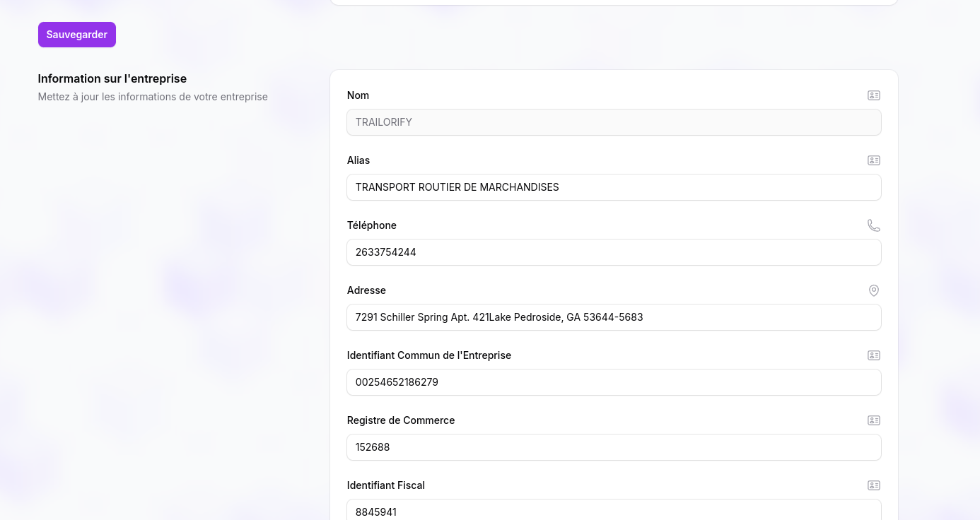 Gérez les détails de votre société comme le nom, l’adresse, le numéro de téléphone, l’email, ainsi que le logo et la signature, directement depuis votre espace personnel.